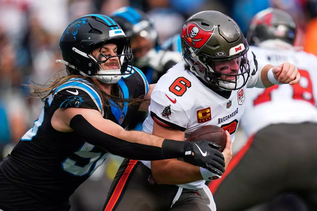 Tampa Bay Buccaneers quarterback Baker Mayfield is sacked by Carolina Panthers linebacker Christian Rozeboom during the first half of an NFL football game, Sunday, Dec. 21, 2025, in Charlotte, N.C. (AP Photo/Erik Verduzco)