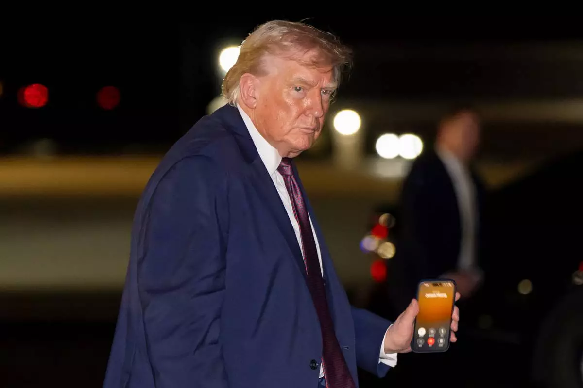 President Donald Trump holds a cell phone with a call to Nvidia CEO Jensen Huang as he departs on Air Force One at Rocky Mount-Wilson Regional Airport, Friday, Dec. 19, 2025, in Elm City, N.C. (AP Photo/Alex Brandon)