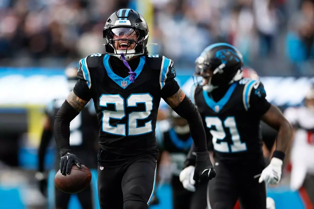 Carolina Panthers safety Lathan Ransom celebrates after their win in an NFL football game between the Carolina Panthers and the Tampa Bay Buccaneers, Sunday, Dec. 21, 2025, in Charlotte, N.C. (AP Photo/Jacob Kupferman)