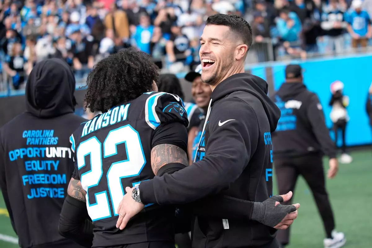 Panthers coach Dave Canales greeted Ransom on the sideline with a huge hug after interception, and smiled as he spoke about the rookie after the game.