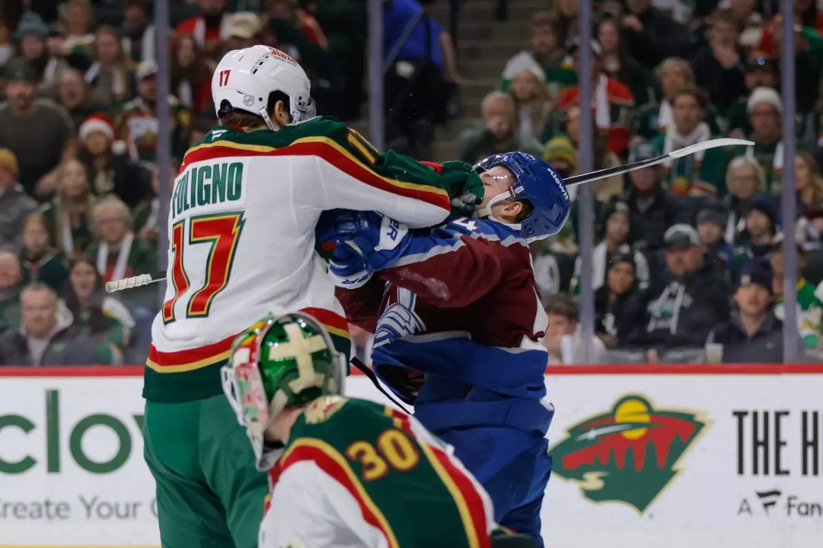 Minnesota Wild left wing Marcus Foligno (17) cross checks Colorado Avalanche center Gavin Brindley during the second period of an NHL hockey game, Sunday, Dec. 21, 2025, in St. Paul, Minn. (AP Photo/Bailey Hillesheim)