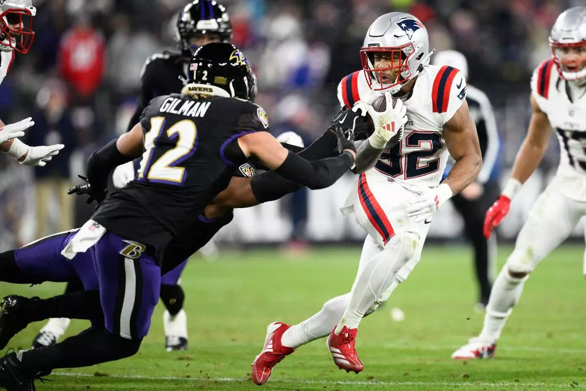 New England Patriots running back Treveyon Henderson (32) runs against Baltimore Ravens safety Alohi Gilman (12) during the first half of an NFL football game, Sunday, Dec. 21, 2025, in Baltimore. (AP Photo/Nick Wass)