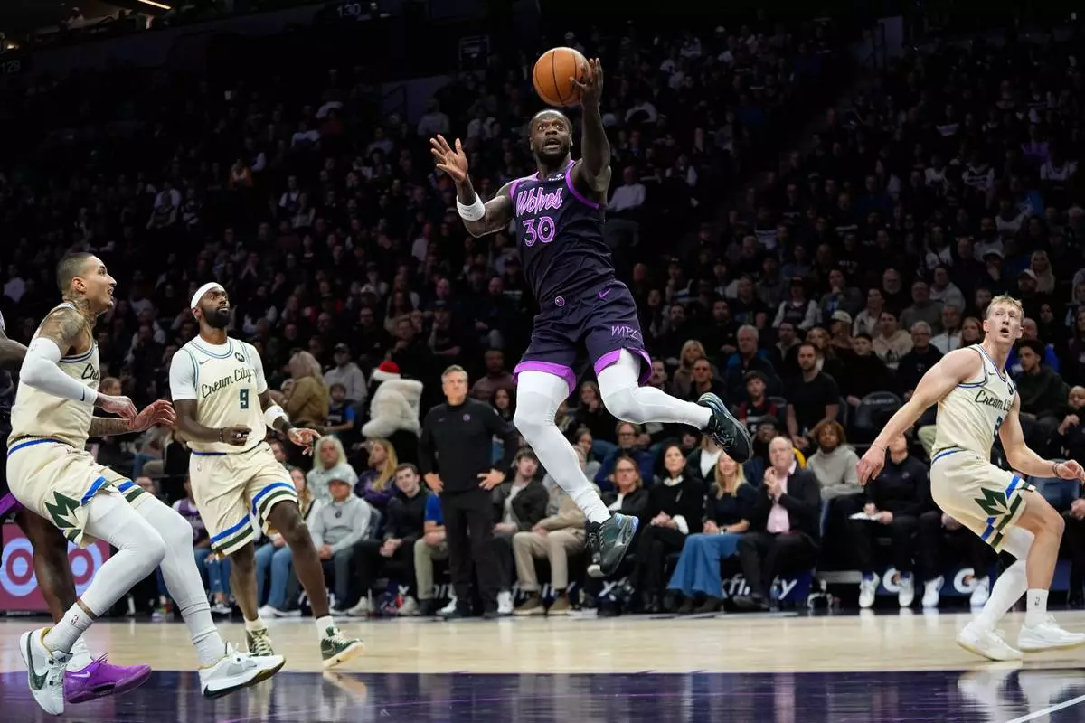 Minnesota Timberwolves forward Julius Randle shoots during the first half of an NBA basketball game against the Milwaukee Bucks, Sunday, Dec. 21, 2025, in Minneapolis. (AP Photo/Abbie Parr)