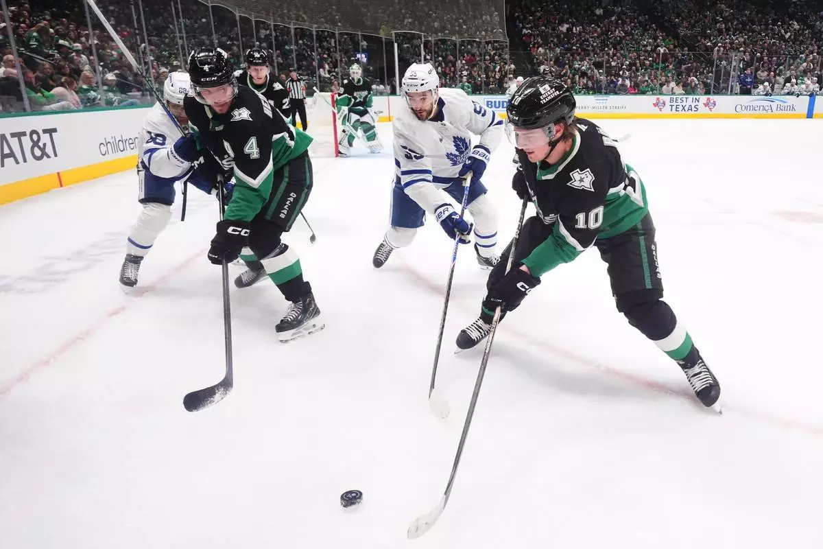 Dallas Stars center Oskar Bäck (10) and defenseman Miro Heiskanen (4) skate for the puck against Toronto Maple Leafs center Nicolas Roy (55) and right wing William Nylander (88) during the second period of an NHL hockey game Sunday, Dec. 21, 2025, in Dallas. (AP Photo/LM Otero)