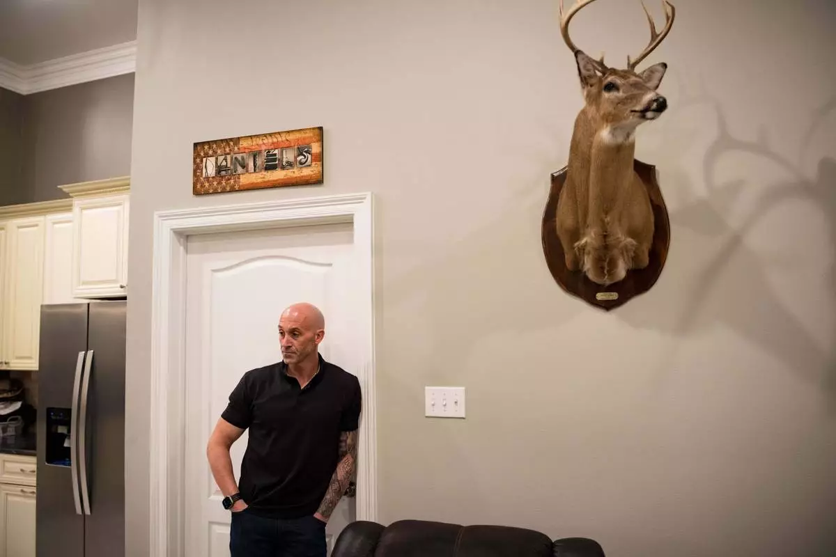 Joseph "Tucker" Daniels listens to lawyers at his home in Thibodaux, La., Thursday, Nov. 13, 2025, after speaking about his 13-year-old daughter being bullied with AI-generated deepfake pornographic images created of her by a boy classmate at Sixth Ward Middle School in August. (AP Photo/Matthew Hinton)