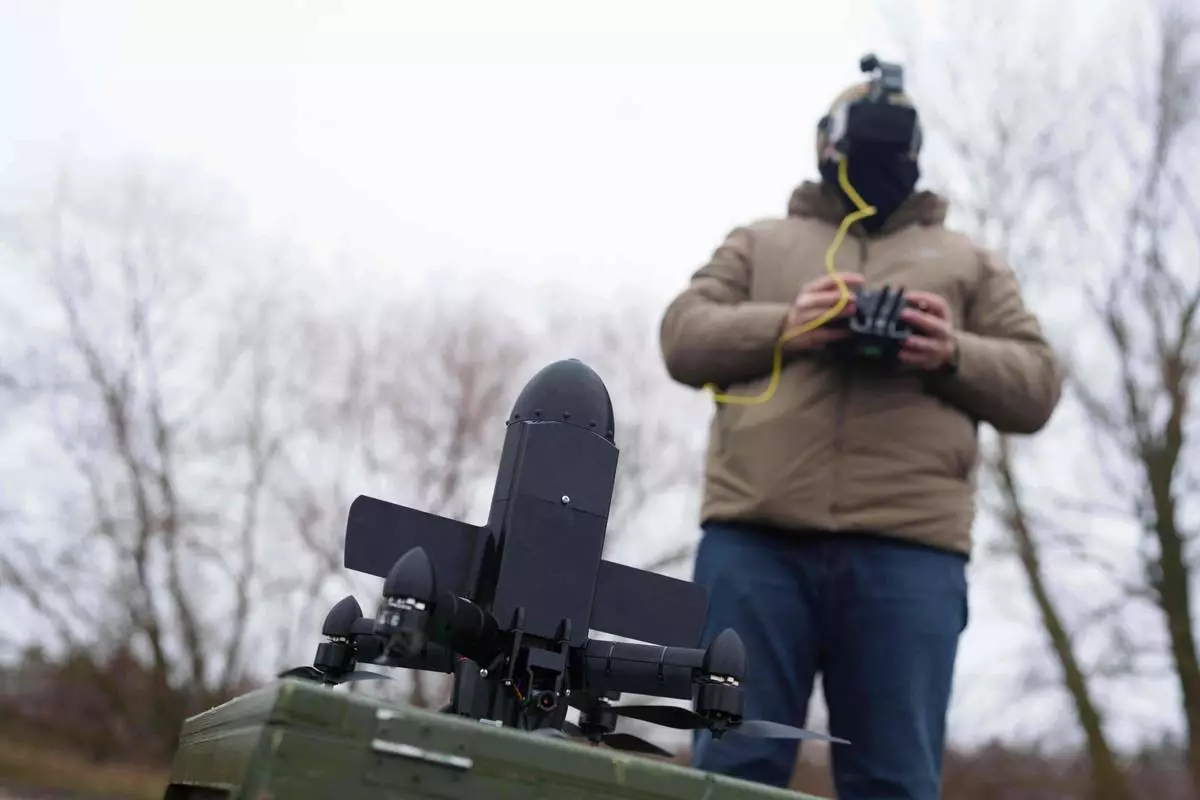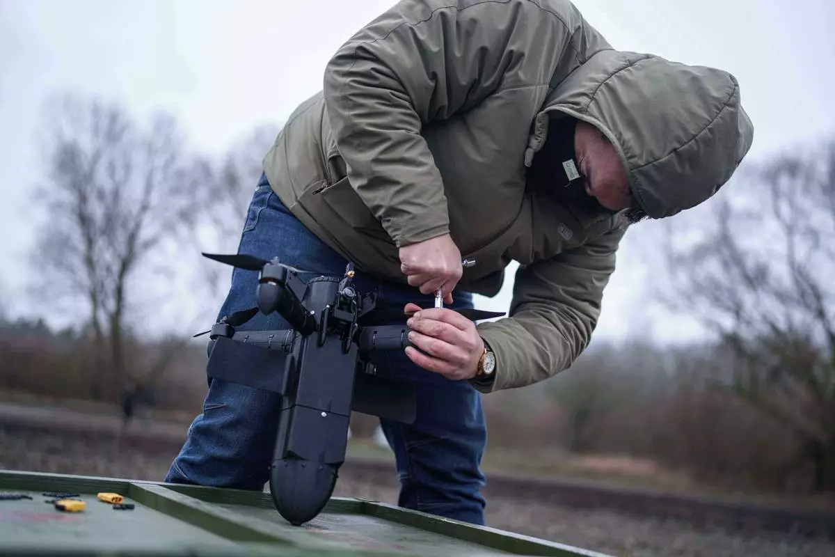 A serviceman prepares an interceptor drone of "General Cherry" company before a flight at the polygon in Ukraine, on Dec. 4, 2025. (AP Photo/Evgeniy Maloletka)
