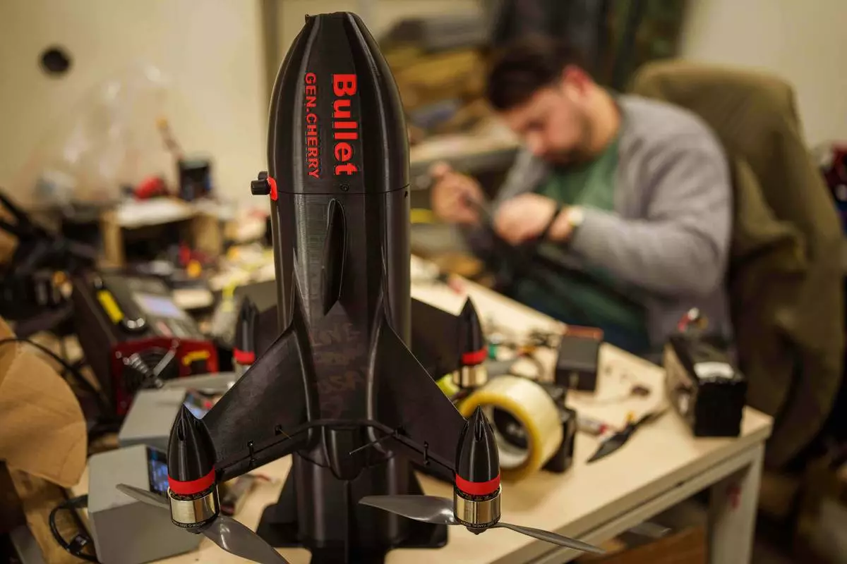 An engineer carries FPV drones of "General Cherry" company at the workshop in Ukraine, on Dec. 4, 2025. (AP Photo/Evgeniy Maloletka)