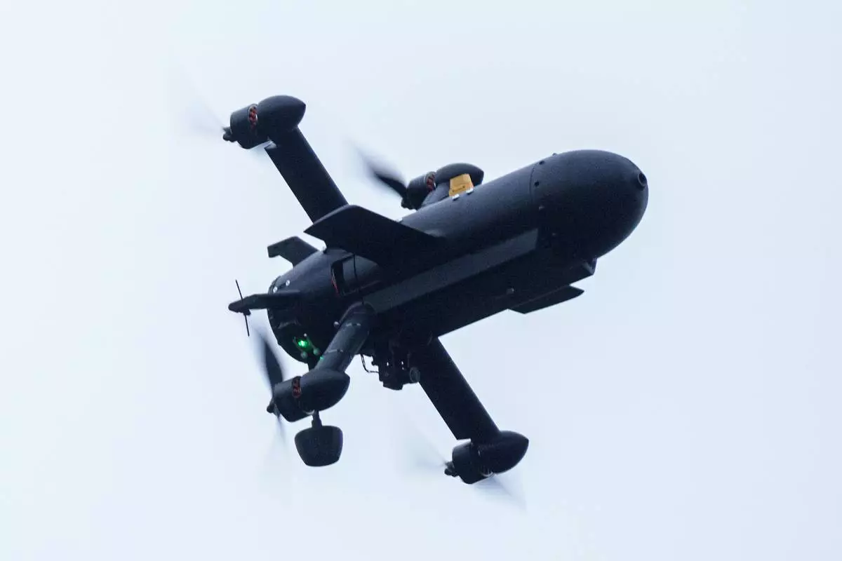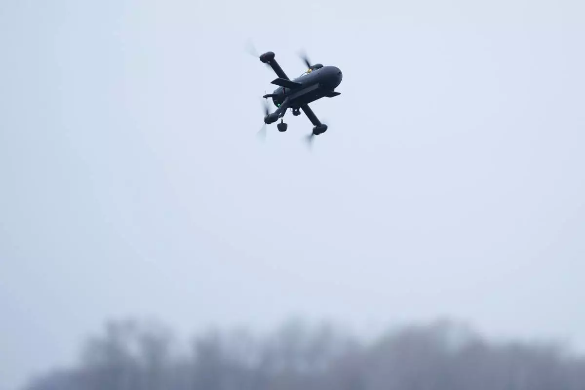 An interceptor drone of "General Cherry" company flys at the polygon in Ukraine, on Dec. 4, 2025. (AP Photo/Evgeniy Maloletka)