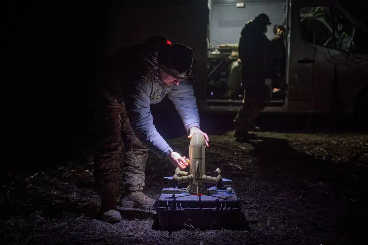 A Ukrainian soldier prepares an interceptor drone during Russia's aerial attack in an undisclosed location in Ukraine, on Dec. 13, 2025. (AP Photo/Efrem Lukatsky)