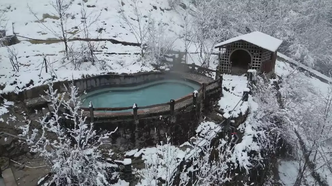 Tourists are able to relax in hot springs while viewing the majestic Mount Gongga, a romantic experience in the winter.
