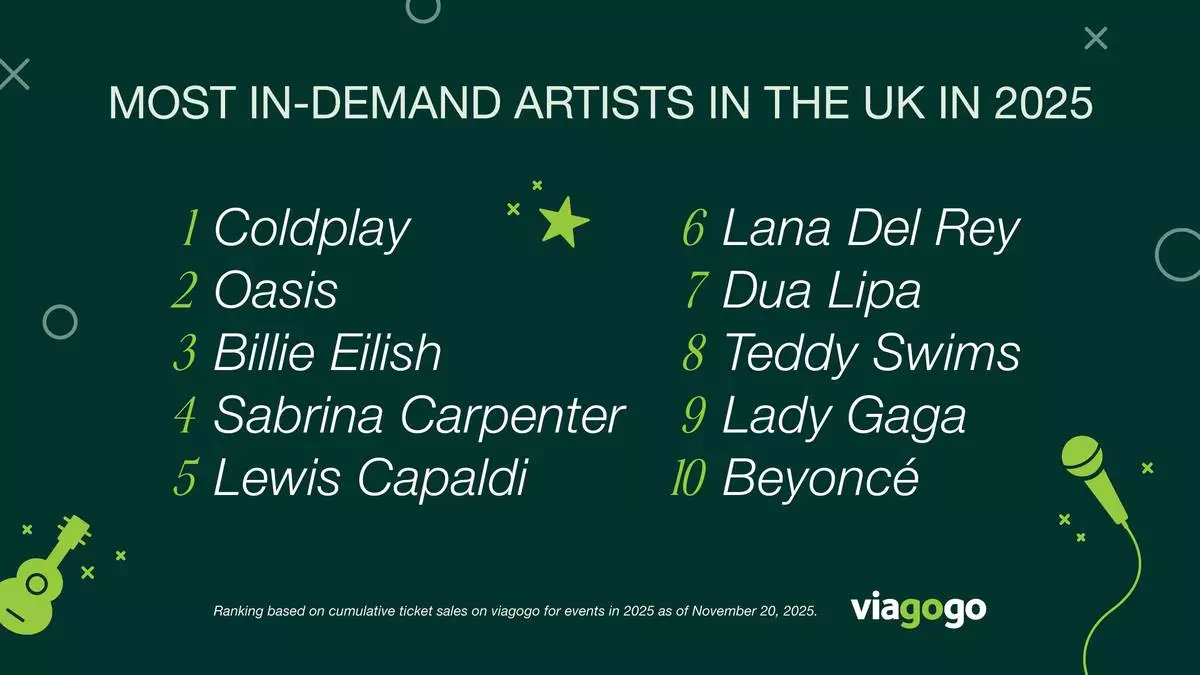 Coldplay took first place as the top selling artist in the UK on viagogo, followed by Oasis. The stars behind hits such as ‘Yellow’ and ‘Fix You’ even topped the poll for drawing in the most international fans who could fill half of London’s O2 arena.