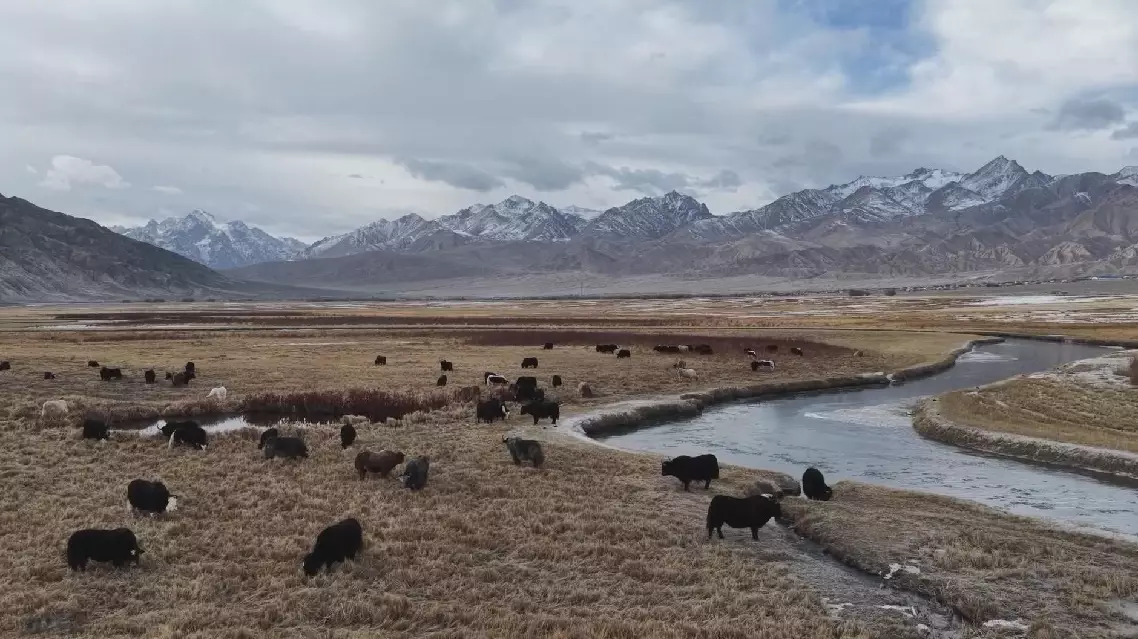Snow blankets the distant mountains, while nearby pastures glow in shades of gold and brown. Cattle and sheep stroll leisurely across the wetland, exuding vibrant vitality.