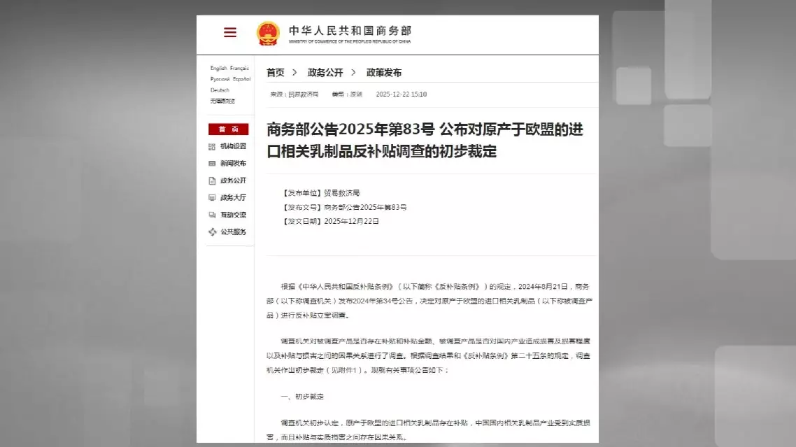 Preliminary evidence indicates that the imported dairy products originating from the EU receive subsidies, China's domestic dairy industry has suffered substantial damage, and there is a causal link between the subsidies and the damage, the ministry said.
