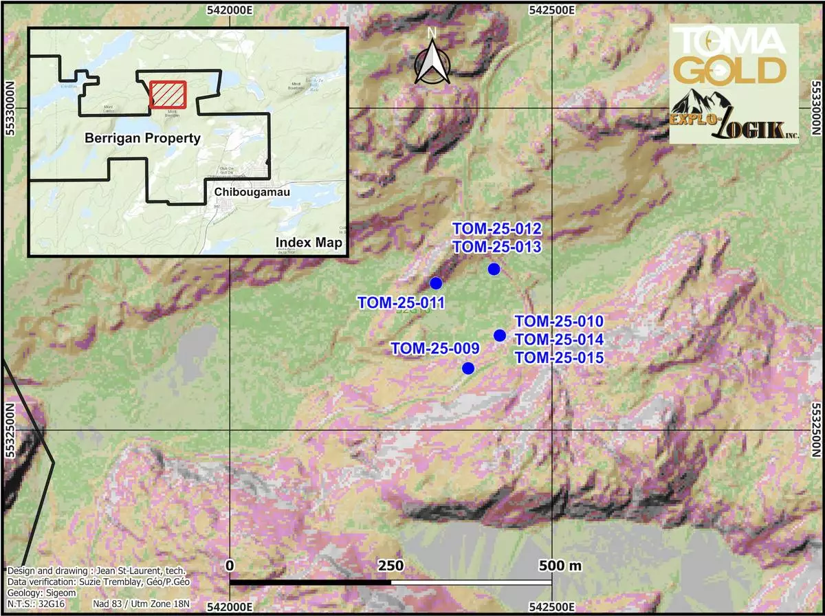 TOMAGOLD CORPORATION (TSXV: LOT; OTCPK: TOGOF) (“ TomaGold ” or the “ Company ”) is very pleased to announce the initial assay results from drill holes TOM-25-009 and TOM-25-010 at its Berrigan Mine project located in the Chibougamau mining camp, in Québec. These are the first two of seven holes for a total of 3,098 metres at Berrigan Mine, with the objective of testing the historical mineralized structure and opening new potential mineralization at depth. The results confirm the presence of high-grade gold-bearing polymetallic vein systems within an extensive mineralized envelope hosted in ultramafic rocks.