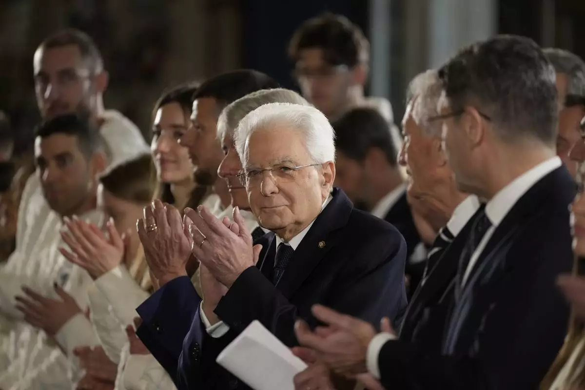 Italian by the Italian President Sergio Mattarella applauds during the hand over ceremony of the Italian flag for the Milan-Cortina Winter Olympic games, at the Quirinale Presidential palace, in Rome, Monday, Dec. 22, 2025. (AP Photo/Gregorio Borgia)