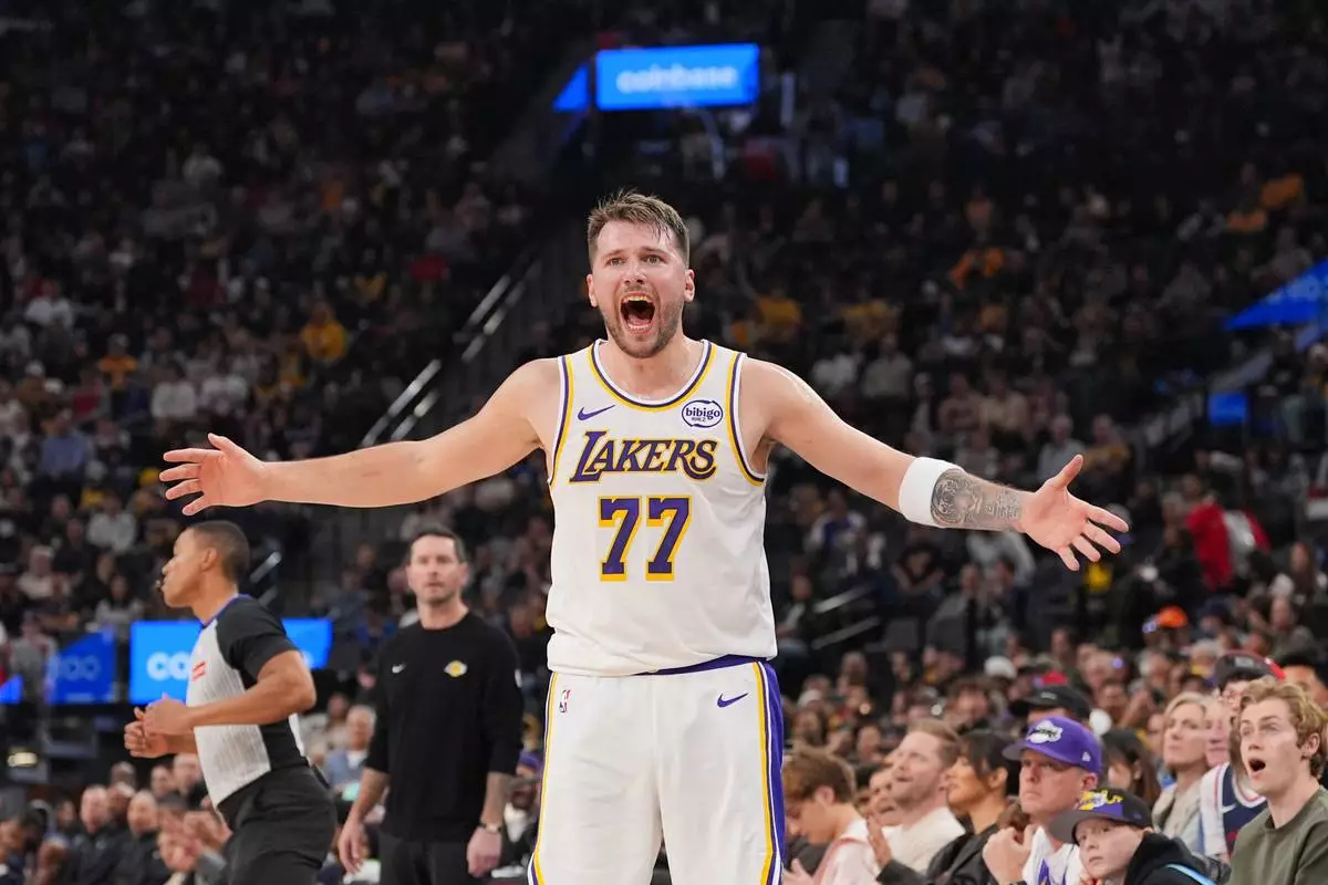 Los Angeles Lakers forward/guard Luka Doncic (77) reacts to a play during the first half of an NBA basketball game against the Los Angeles Clippers Saturday, Dec. 20, 2025, in Inglewood, Calif. (AP Photo/Jae C. Hong)