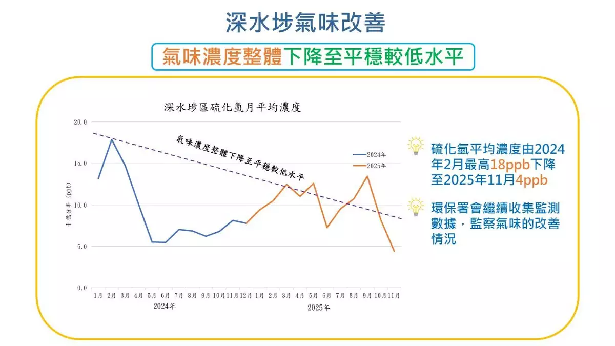 Over the past three years, the Environmental Protection Department (EPD) has proactively used innovative technologies in identifying and rectifying sewer misconnections to improve nearshore odour problems along Victoria Harbour. By the third quarter of this year, EPD teams had inspected over 5 000 manholes and tested more than 1 200 water samples in Tsuen Wan, Kwai Tsing, and Sham Shui Po districts, identifying 191 pollution cases equivalent to pollution load from 300 000 people. Through inter-departmental collaboration, the total pollution load from outfalls in Tsuen Wan and Sham Shui Po districts has been reduced by nearly 90 per cent, leading to substantial improvement in nearshore odour. Hydrogen sulfide monitoring devices installed at the Tsuen Wan and Sham Shui Po waterfronts indicated that the average concentrations have decreased from the previous 36 parts per billion (ppb) and 18 ppb, respectively to currently both below 5 ppb (see photos).