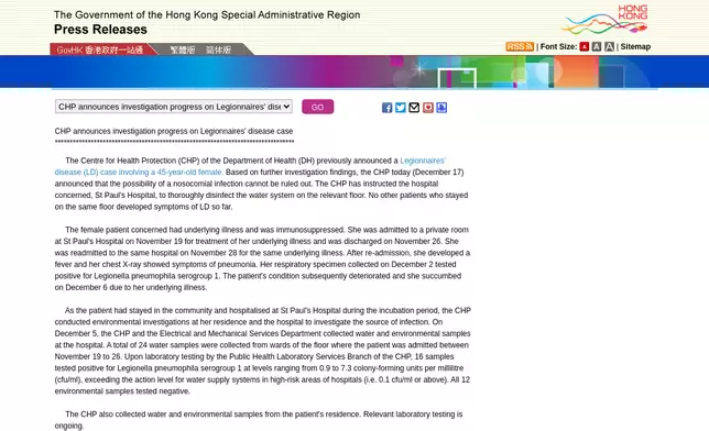From December 14 to 20, the CHP recorded four community-acquired LD cases. All of the patients involved had underlying illnesses. The details of the cases are as follows: