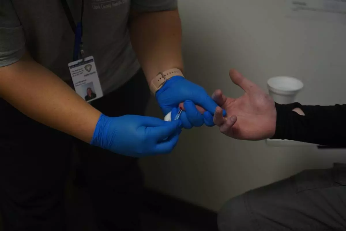 A participant in the syringe exchange program receives a blood draw during a visit at the Clark County Health Department Tuesday, Nov. 23, 2025, in Jeffersonville, Ind. (AP Photo/Obed Lamy)
