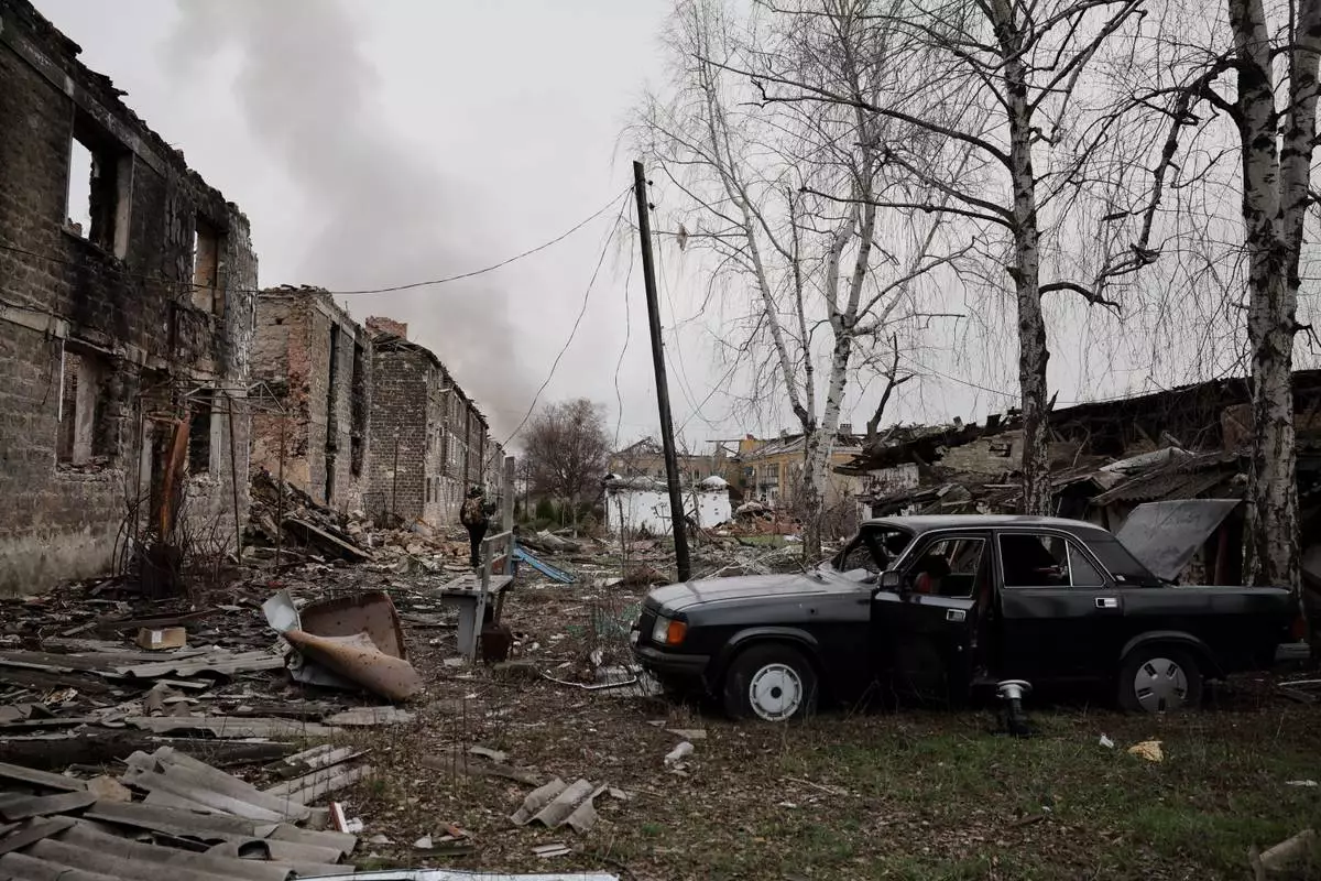 In this photo taken on Saturday Dec. 20, 2025 and provided by Ukraine's 24th Mechanized Brigade press service, a soldier walks through the ruins of the town of Kostyantynivka, in the Donetsk region, Ukraine. (Oleg Petrasiuk/Ukraine's 24th Mechanized Brigade via AP)