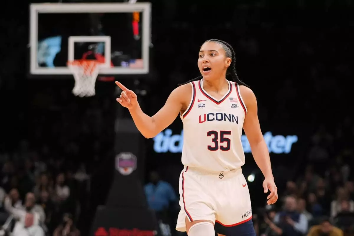 UConn's Azzi Fudd (35) gestures to teammates after making a three-point shot during the second half of an NCAA college basketball game against the Iowa Saturday, Dec. 20, 2025, in New York. (AP Photo/Frank Franklin II)