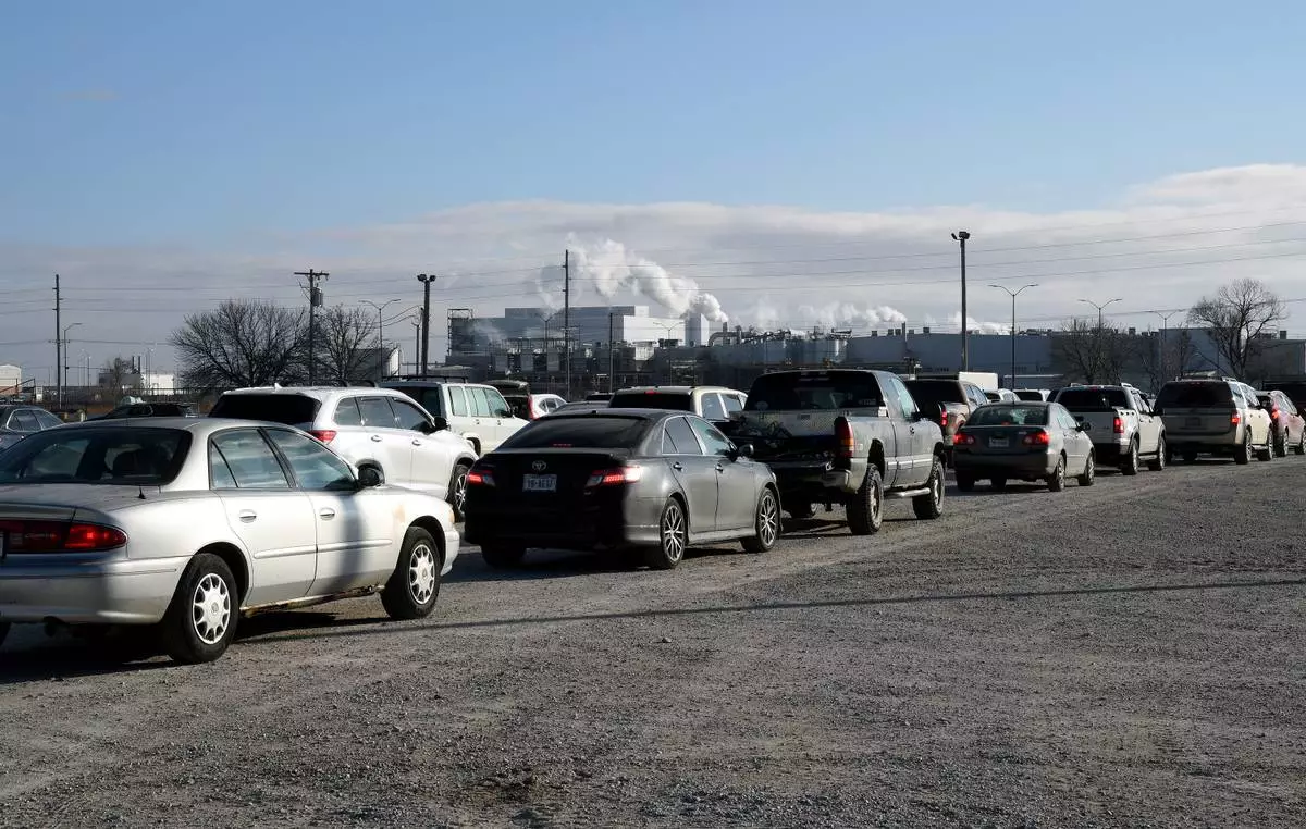 Drivers wait in line at a mobile food bank organized by Crossroads Mission Avenue near the Tyson Foods' beef plant in Lexington, Neb., Thursday, Dec. 4, 2025. (AP Photo/Thomas Peipert)