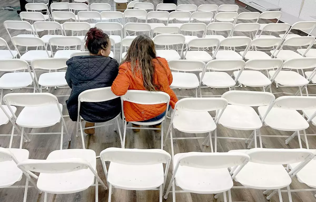 Two women listen during an informational meeting held by the Nebraska Department of Labor for Tyson Foods employees in Lexington, Neb., Thursday, Dec. 4, 2025. (AP Photo/Thomas Peipert)