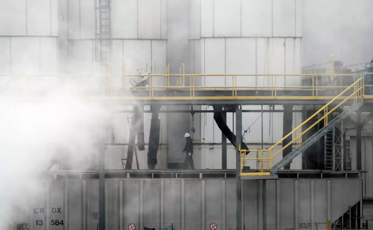 A worker walks through steam coming from the Tyson Foods' beef plant in Lexington, Neb., Thursday, Dec. 4, 2025. (AP Photo/Thomas Peipert)