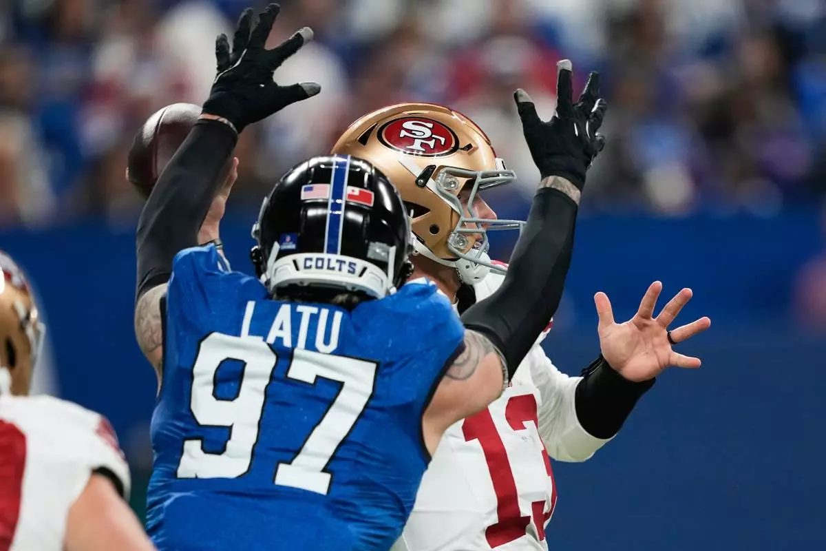 San Francisco 49ers quarterback Brock Purdy, right, is hit by Indianapolis Colts defensive end Laiatu Latu (97) while throwing a pass during the first half of an NFL football game, Monday, Dec. 22, 2025, in Indianapolis. (AP Photo/Carolyn Kaster)