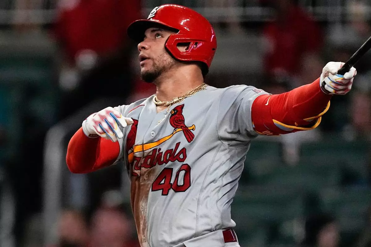 FILE - St. Louis Cardinals' Willson Contreras (40) watches his solo home run in the seventh inning of a baseball game against the Atlanta Braves Sept. 6, 2023, in Atlanta. (AP Photo/John Bazemore, File)