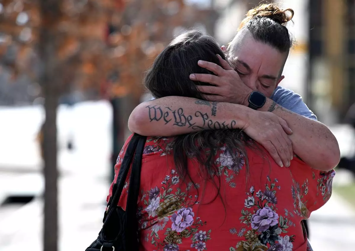 Crystina Page, back, hugs Angelika Stedman outside the El Paso County Courthouse in Colorado Springs, Colo., Monday, Dec. 22, 2025, before speaking to the press ahead of the court hearing for Return to Nature funeral home owners Jon and Carie Hallford. (Christian Murdock/The Gazette via AP)