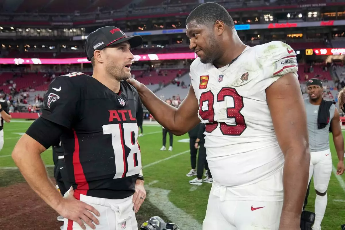 Atlanta Falcons quarterback Kirk Cousins (18) and Arizona Cardinals defensive tackle Calais Campbell (93) speak after an NFL football game, Sunday, Dec. 21, 2025, in Glendale, Ariz. (AP Photo/Rick Scuteri)
