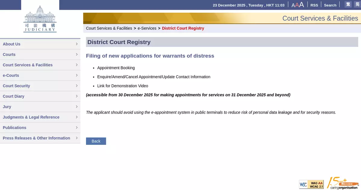 Applicants can make online appointments via www.judiciary.hk/en/court_services_facilities/dtci_index.html for attending the District Court Registry to file new applications for warrants of distress. Registered users of "iAM Smart" may use the auto form-filling function of "iAM Smart" to provide relevant personal data for making online appointments. Guidance Notes with details are available on the above dedicated webpage.