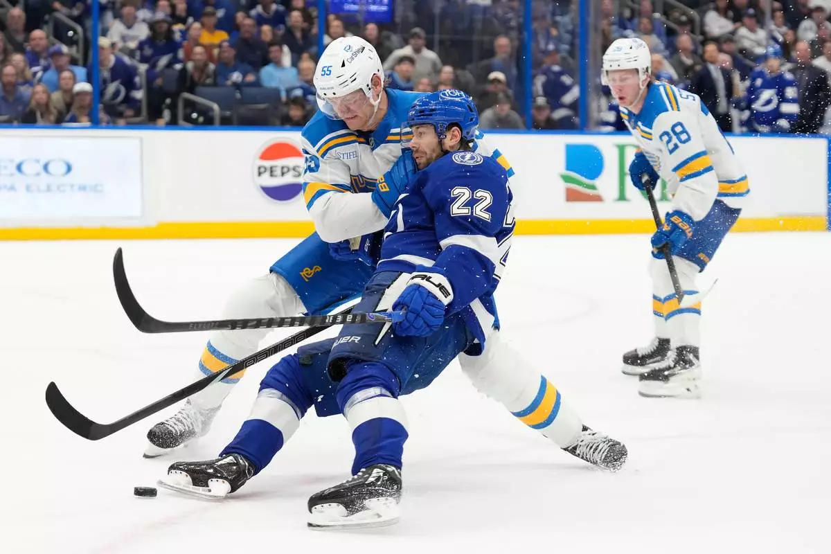 St. Louis Blues defenseman Colton Parayko (55) knocks Tampa Bay Lightning right wing Oliver Bjorkstrand (22) off the puck during the second period of an NHL hockey game Monday, Dec. 22, 2025, in Tampa, Fla. (AP Photo/Chris O'Meara)