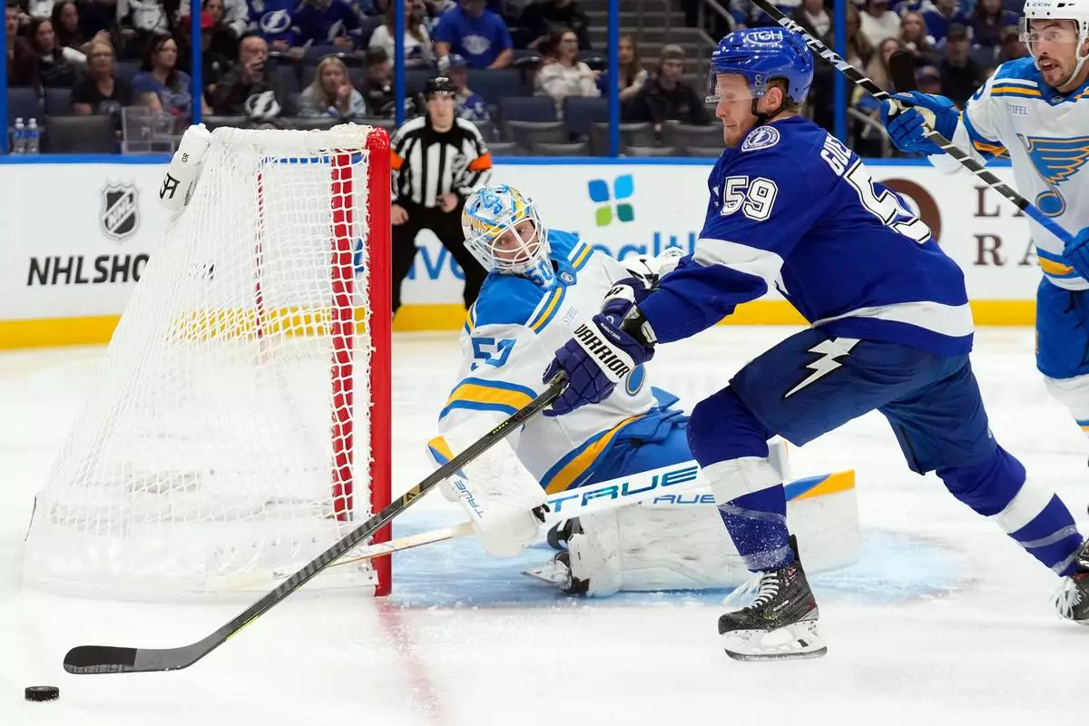 St. Louis Blues goaltender Jordan Binnington (50) makes a save on a shot by Tampa Bay Lightning center Jake Guentzel (59) during the second period of an NHL hockey game Monday, Dec. 22, 2025, in Tampa, Fla. (AP Photo/Chris O'Meara)