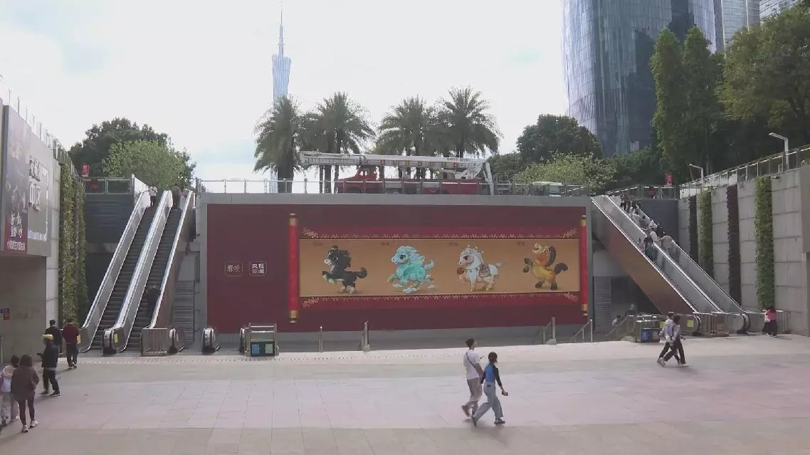 In Guangzhou City, a bustling economic hub in southern China, images of the Spring Festival Gala mascots are prominently displayed on screens in popular shopping districts, attracting many residents who made a stop to snap photos.