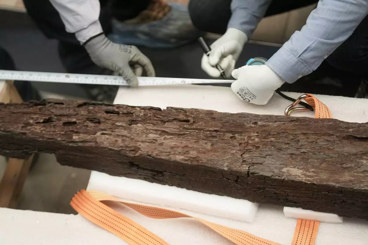 Archeologists measure an ancient wooden block as they prepare to reassemble the second solar boat of King Khufu, at the Grand Egyptian Museum in Giza, Egypt, Tuesday, Dec. 23, 2025. (AP Photo/Amr Nabil)