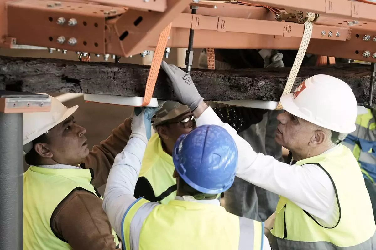 Archeologists carry an ancient wooden block as they reassemble the second solar boat of King Khufu, at the Grand Egyptian Museum in Giza, Egypt, Tuesday, Dec. 23, 2025. (AP Photo/Amr Nabil)