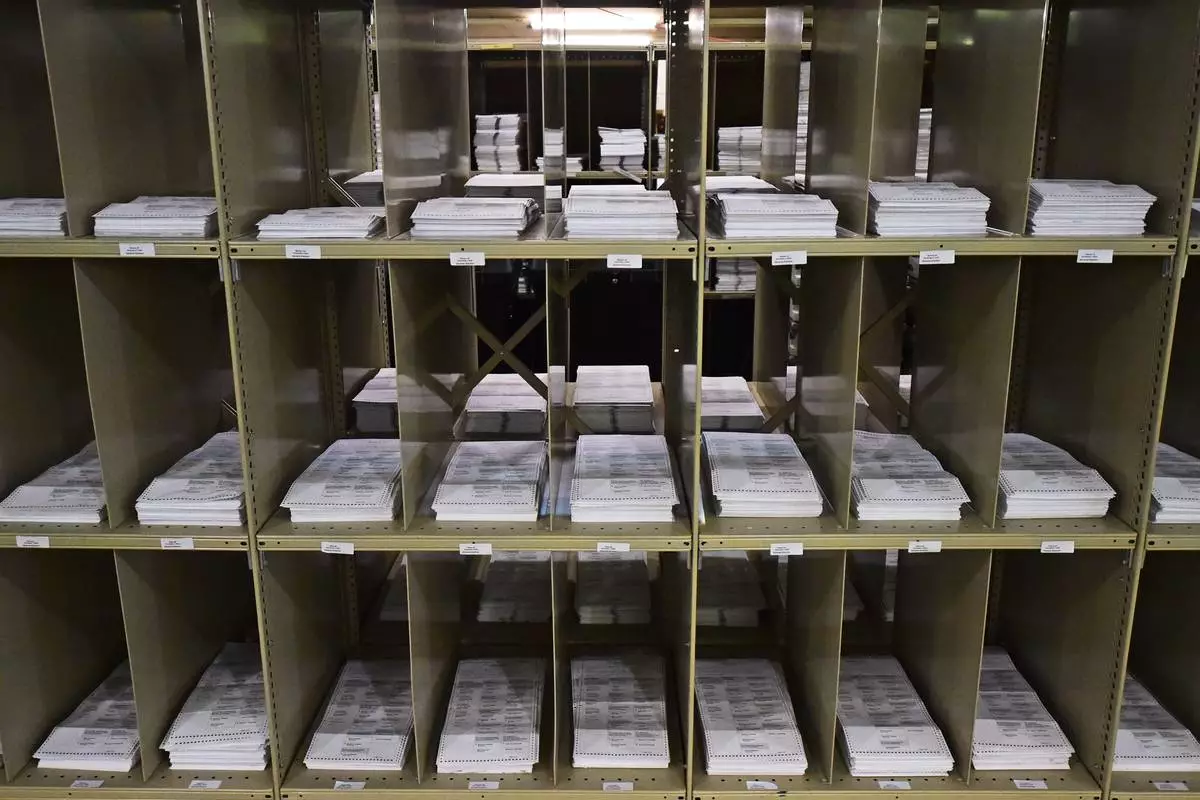 FILE - Mail-in ballots sit on shelves inside the Trumbull County Board of Elections, Nov. 3, 2020, in Warren, Ohio. (AP Photo/David Dermer, File)