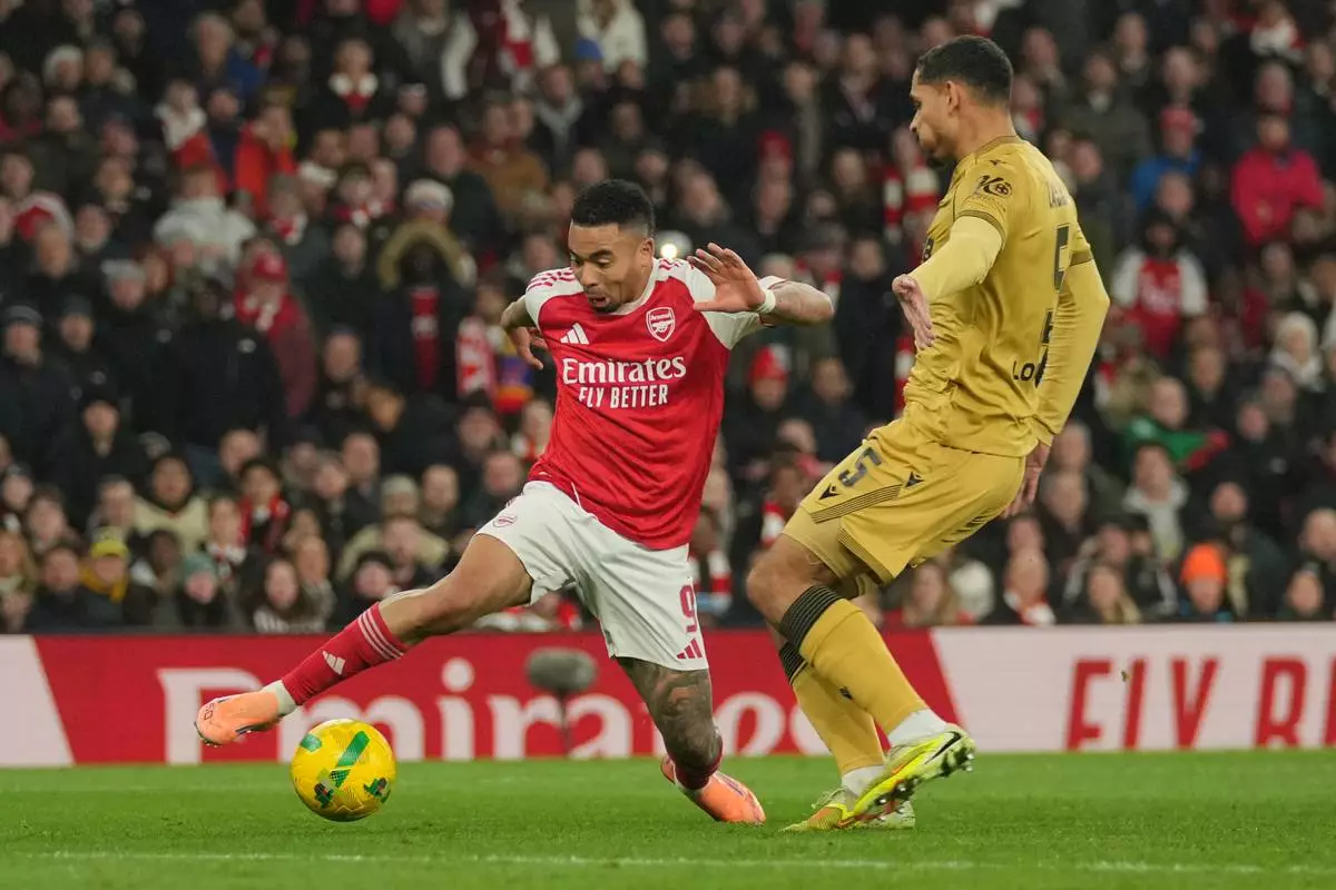 Crystal Palace's Maxence Lacroix guards Arsenal's Gabriel Jesus during the English Football League Cup quarter-final soccer match between Arsenal and Crystal Palace in London, Tuesday, Dec. 23, 2025. (AP Photo/Kin Cheung)