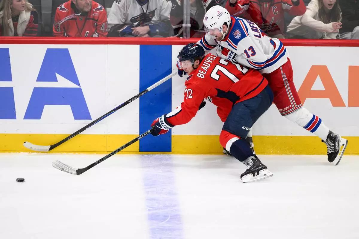 Washington Capitals left wing Anthony Beauvillier (72) and New York Rangers left wing Alexis Lafrenière (13) chase after the puck during the third period of an NHL hockey game, Tuesday, Dec. 23, 2025, in Washington. (AP Photo/Nick Wass)