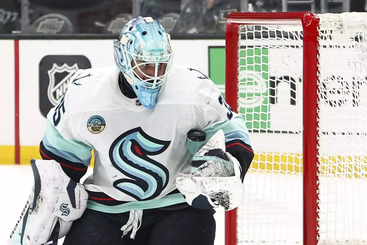Seattle Kraken goaltender Joey Daccord makes a save during the second period of an NHL hockey game against the Los Angeles Kings, Tuesday, Dec. 23, 2025, in Los Angeles. (AP Photo/Jessie Alcheh)