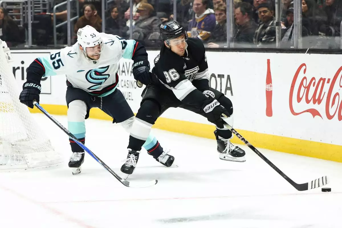 Los Angeles Kings right wing Adrian Kempe (9) battles for the puck against Seattle Kraken defenseman Cale Fleury, back, during the second period of an NHL hockey game, Tuesday, Dec. 23, 2025, in Los Angeles. (AP Photo/Jessie Alcheh)