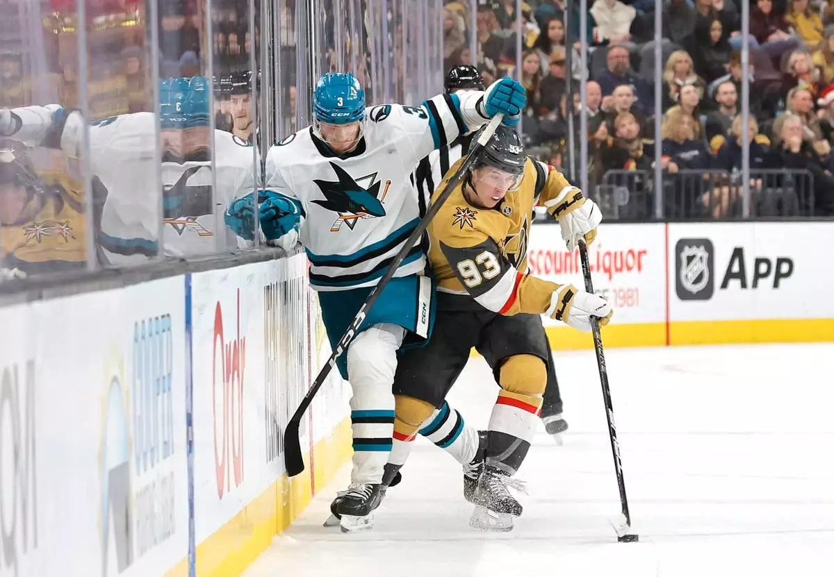San Jose Sharks defenseman John Klingberg (3) and Vegas Golden Knights right wing Mitch Marner (93) fight for the puck during the second period of an NHL hockey game Tuesday, Dec. 23, 2025, in Las Vegas. (AP Photo/Steve Marcus)