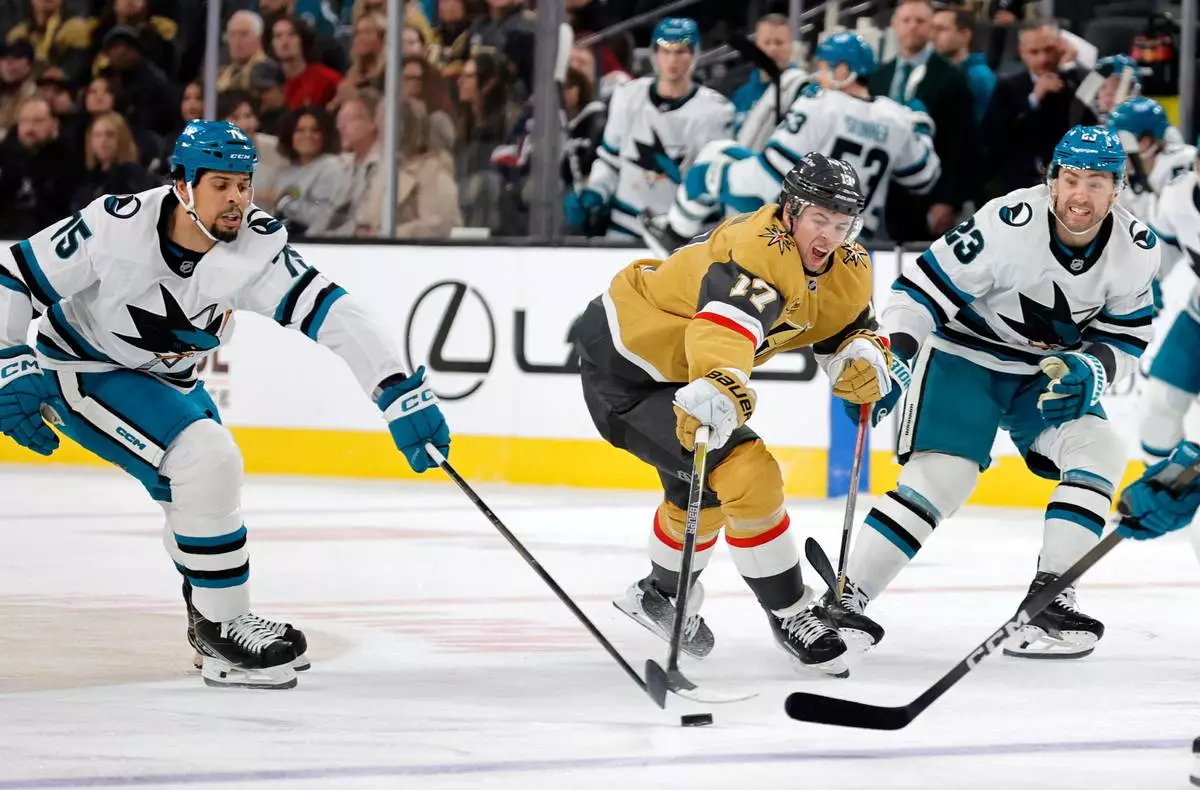 Vegas Golden Knights defenseman Ben Hutton (17) reaches for the puck between San Jose Sharks right wing Ryan Reaves (75) and center Barclay Goodrow (23) during the second period of an NHL hockey game Tuesday, Dec. 23, 2025, in Las Vegas. (AP Photo/Steve Marcus)