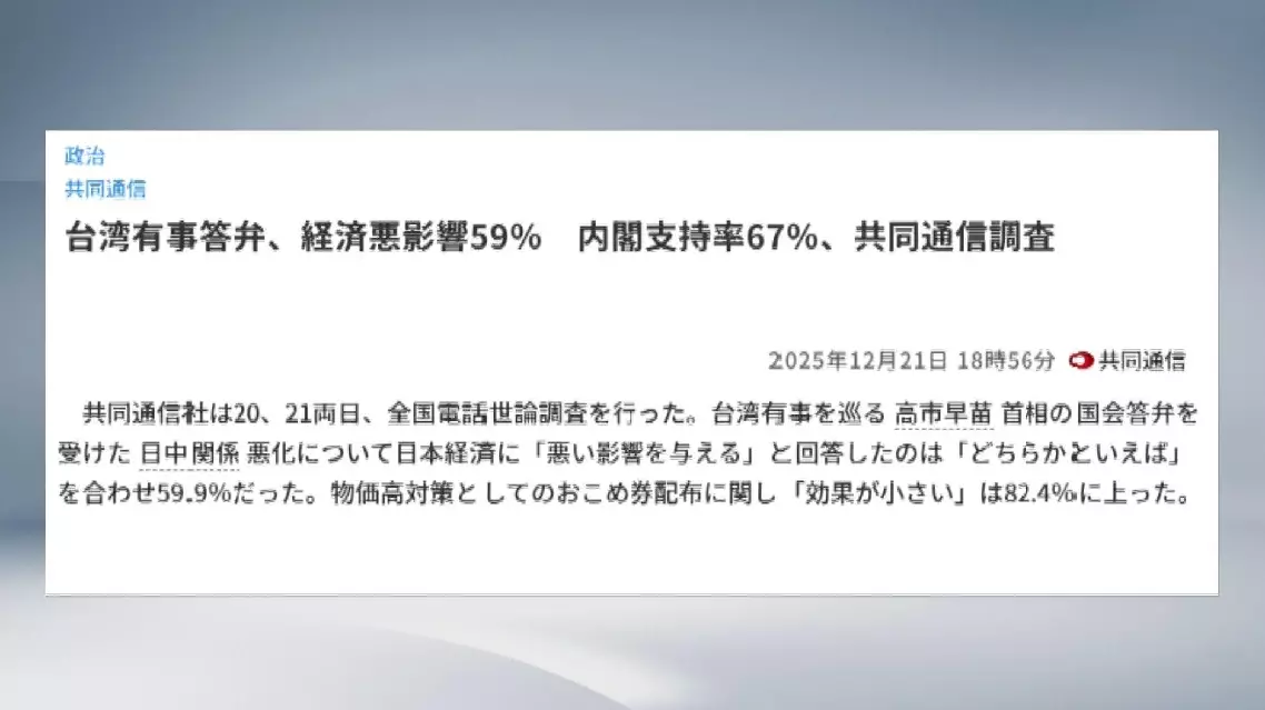 According to a recent survey conducted by Kyodo News, more than half of the respondents believed that Japanese Prime Minister Sanae Takaichi's recent erroneous remarks regarding China's Taiwan region will have an adverse effect on Japan's economy.