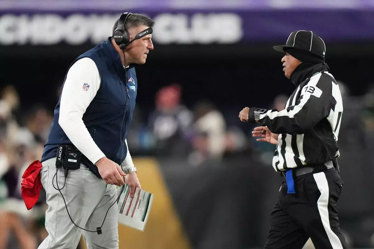 New England Patriots head coach Mike Vrabel, left, reacts toward down judge Patrick Turner (13) during the first half of an NFL football game against the Baltimore Ravens, Sunday, Dec. 21, 2025, in Baltimore. (AP Photo/Stephanie Scarbrough)