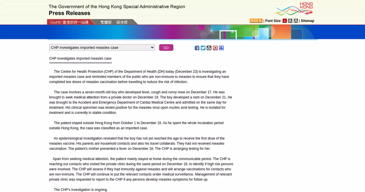 The Centre for Health Protection (CHP) of the Department of Health (DH) today (December 24) is investigating an imported measles case. The patient is the mother of the imported measles case announced yesterday (December 23). The CHP reminded members of the public who are non-immune to measles to ensure that they have completed two doses of measles vaccination before travelling to reduce the risk of infection.