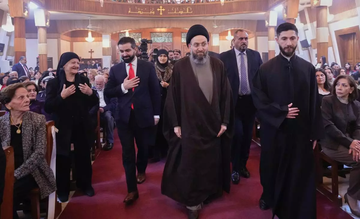 Ammar al-Hakim, center, a Shiite leader attends a Christmas Eve Mass at Our Lady of Salvation Church in central Baghdad, Iraq, Wednesday, Dec. 24, 2025. (AP Photo/Hadi Mizban)