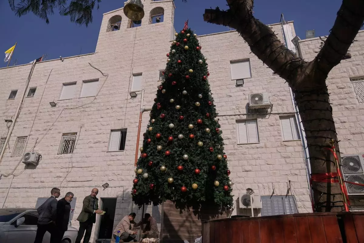 Palestinian parishioners check a recently installed Christmas tree after the previous one was destroyed at the Holy Redeemer Latin Church in the West Bank town of Jenin, Tuesday, Dec. 23, 2025. (AP Photo/Majdi Mohammed)